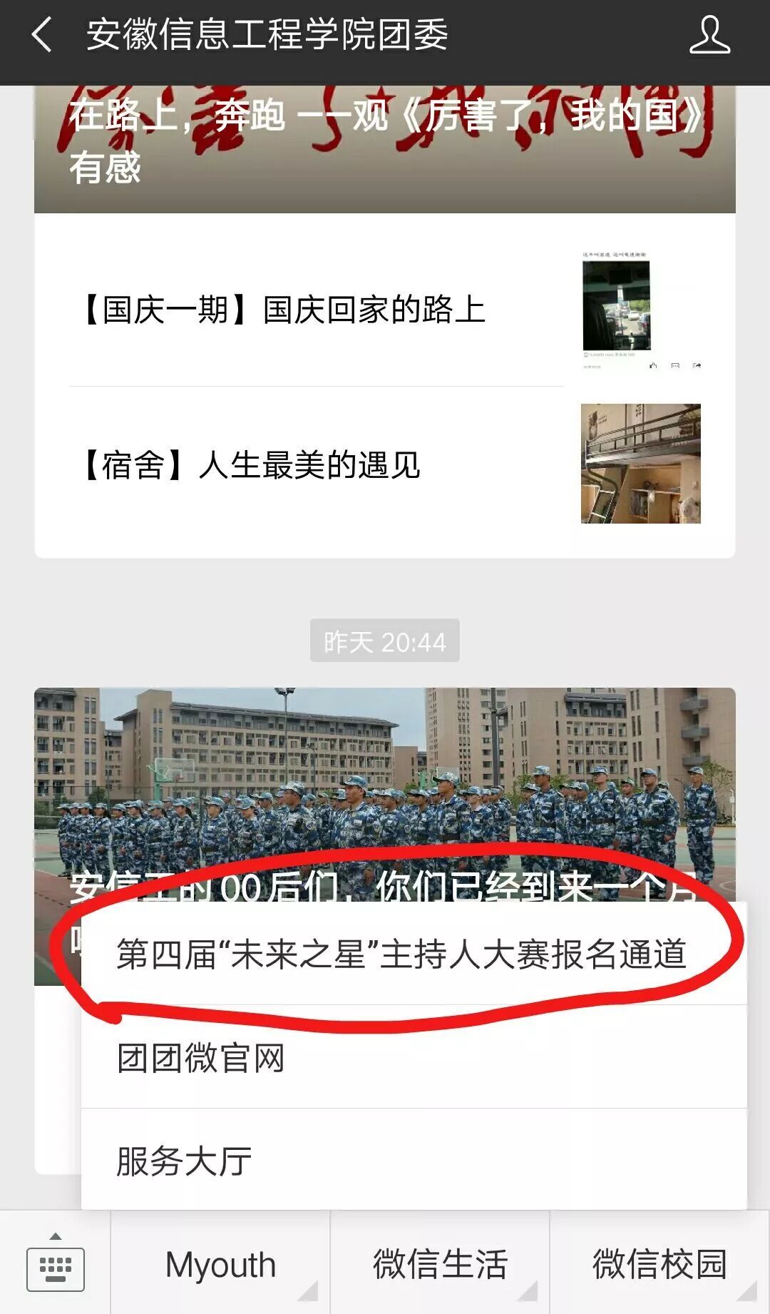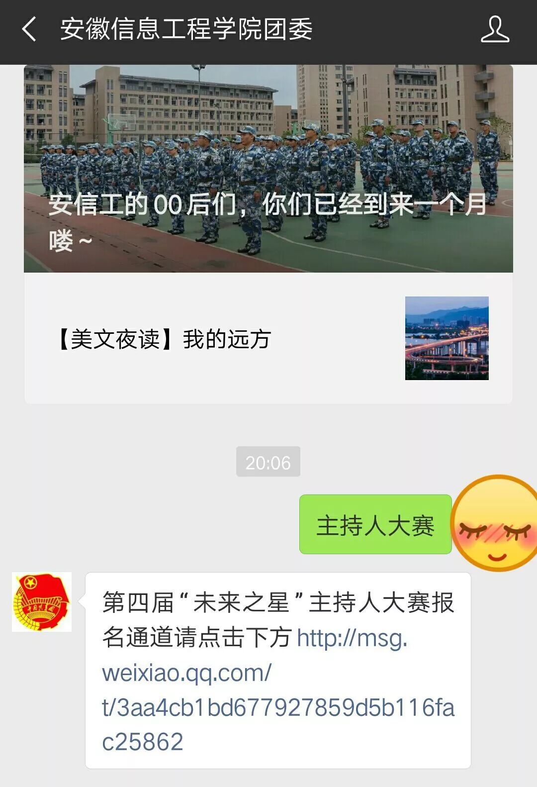 关注安徽信息工程学院团委微信公众号,点击右下角“微信校园”,进入第四届“未来之星”主持人大赛报名渠道,提交个人信息。
